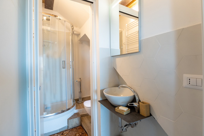 - Doccia 80x80 con chiusura in vetro e pedana;